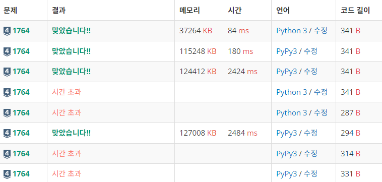 나의 생각대로 쉬운 편인 문제였지만,, 시간초과와의 사투를 벌였다..! 시간 초과 나서 미량이한테 힌트 달라고 해서 푼 게 '코드2' 이고, 미량이 코드를 보고 나서 풀어 본 게 '코드3' 이다. 근데 제출 결과를 보면 알 수 있듯, 코드2와 코드3의 시간 차가 미쳤다. 미량인 천재인가보다... 어떻게 저렇게 풀지,, 나는 시간 초과 났을 때 set() 으로 해결했던 적이 잘 없는 것 같은데, 미량인 무조건 시간초과 나면 set()을 최대한 이용해 풀어보려고 한다고 한다. 나도 앞으로는.. set()을 적극 이용해보게써!