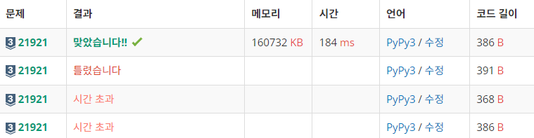 어제 문제 하루 있다 풀어서 설명을 다 듣고 풀게 되었다.. ㅎㅎ 어제 문제 안푼 나 반성합니다... 그래도 먼저 생각나는 방법으로 한 번 풀어보고 시간 초과를 우선적으로 당해보았다,,^^ 그리고 설명 들었던 것을 회상하며 코드를 써내려갔다. 생각이 안날 줄 알았는데, 그래도 설명을 이해를 했었나보다. 잘 풀어나갔다! 근데 틀렸습니다가 떠서 당황... 그건 visits 리스트에 처음 구한 sum_visitors의 값을 안 넣고 시작해서 틀렸던 것이었다. 쨋든 다른 코드 보지 않고 혼자 힘으로 풀어냈댱 - !!
