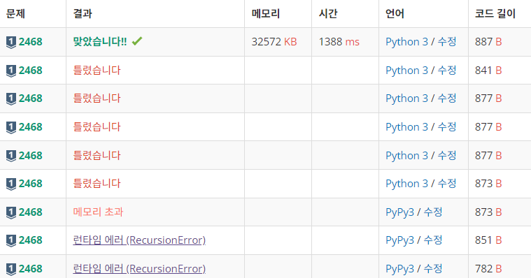 dfs 마스터 중인 1인... but, wow 계속 틀려서... 화낼 뻔 했쟈낭,, 근데 첨엔 그냥 쓴 코드여서 설마 이게 맞는다고? 하고 내긴 했었다.. 내가 틀렸던 부분이 처음에 코드 작성하면서 이거 좀 이상한 거 같은데..? 한 부분이었다. arr의 최소 높이, 최대 높이 구하는 부분이 틀렸었다. min_height = min(min(arr)), max_height = max(max(arr)) 이래 썼었는데, 찾아보니까 이차원 배열에다가 min, max를 쓰면 각 행의 합이 가장 작거나 큰 값을 찾아준다고 한다. 그니까 제대로된 최소, 최대값을 찾지 못하는 것이었던 것이야... 그래서 올바른 최소값과 최대값을 찾을 수 있는 식을 배워왔다! min(map(min, arr)) 과 max(map(max, arr)) . 단디 기억해 두겠다 .