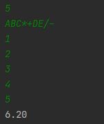 첫째 줄에 피연산자의 개수(1 ≤ N ≤ 26) 가 주어진다. 그리고 둘째 줄에는 후위 표기식이 주어진다. (여기서 피연산자는 A~Z의 영대문자이며, A부터 순서대로 N개의 영대문자만이 사용되며, 길이는 100을 넘지 않는다) 그리고 셋째 줄부터 N+2번째 줄까지는 각 피연산자에 대응하는 값이 주어진다. 3번째 줄에는 A에 해당하는 값, 4번째 줄에는 B에 해당하는값 , 5번째 줄에는 C ...이 주어진다, 그리고 피연산자에 대응 하는 값은 100보다 작거나 같은 자연수이다.