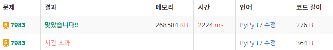 이 코드를 쓰고 아주 뿌듯해 했지만 ... 처참히 시간초과 남 ^^^^ 그래서 내일 할거야를 진짜 내일 할거야 하고 안해버렸다는 ㅎㅎ